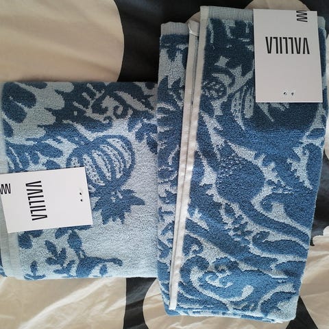 Myydään uudet, laput kiinni, Vallila Laululintu pyyhkeet, iso (70x140) ja pieni (50x70).