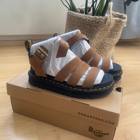 Dr. Martens sandaalit, koko 38. Sandaaleissa on musta paksu pohja ja ruskeat nahkaiset remmit sekä nauhakiinnitys. Materiaalina on nahka ja kumipohja. Harmillisesti itselleni liian suuret. Hintaan lisätään pk.