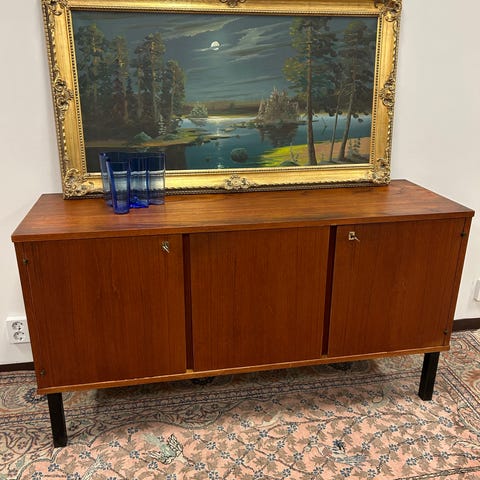 Tiikkisenkki/TV-taso. Siisti, käytönjälkiä, hajuton. Toisessa laidassa pieni kolhu, näkyy yhdessä kuvista. Hinta 260€