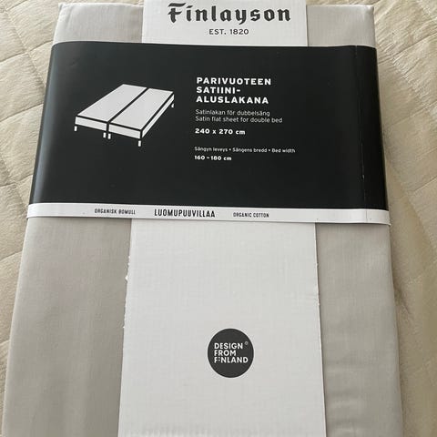 Finlayson aluslakana, koko 150 x 270 cm. Materiaalina 100 % luomupuuvilla. Suunniteltu käytettäväksi taso- tai joustinpatjan päällä. Väri vaalea, yksivärinen. Sopii yhden hengen sänkyyn tai leveään runkopatjaan mittojen mukaan. Design from Finland -merkintä pakkauksessa.