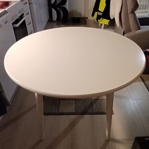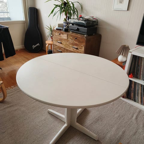 Iskun puinen pyöreä ruokapöytä. Maalattu itse valkoiseksi, reunoista hieman maali lähtenyt.