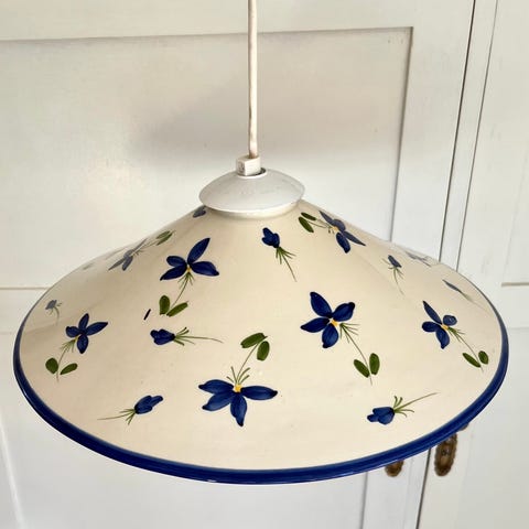 Sinivalkoinen Espanjasta ostettu keraaminen, kukkakuviotu riippuvalaisin, aaltoileva alareuna. 6 ilman kulkuaukkoa.