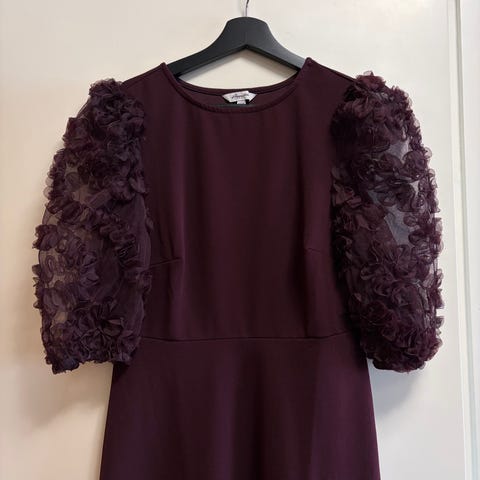 Claire samettimekko, koko 38. Musta (valossa väri näyttää violetinmustalta, ei ihan tumma sysimusta, sopii useammille paremmin kuin ihan musta), pitkähihaisen mallinen mekko, jossa pyöreä pääntie, kevyesti A-linjainen. Pääntiessä todella kaunis koristeellinen kivikoristelu. Hihansuissa kuminauharypytys, takana piilovetoketju. Materiaalina pehmeä sametti.