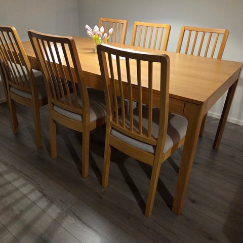 Pöytä ostettu käytettynä 320€ ja tuolit Ellokselta (nykyinen hinta on 300€/2kpl)
