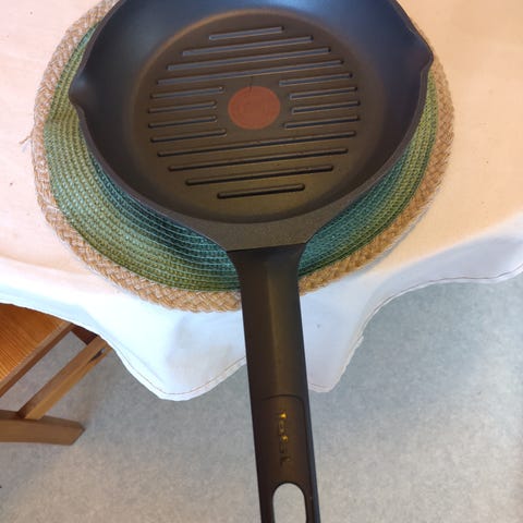 Kannen nuppi on hieman palanut, mutta muuten pannu on uudenveroisessa kunnossa, käytetty kerran tai kaksi.