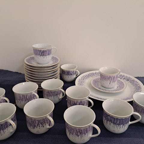 Kahviastiasto vaaleansinisillä kukkakoristeilla. Astiasto sisältää 9 kahvilautasta, 7 kahvikuppia, 12 pullalautasta, 2 tarjoilulautasta ja 2 sokerikkoa, tosessa myös kansi.