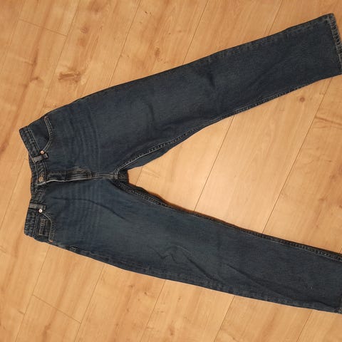 Ehjät käytetyt, polvista likaantuneet farkut kokoa 28.