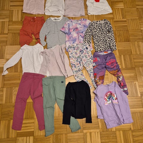 Lasten vaatepakkaus, jossa on useita t-paitoja ja pitkähihaisia paitoja tytöille koossa 110-116. Vaatteet ovat monivärisiä ja niissä on erilaisia kuoseja ja hahmoprinttejä. Mukana on sekä lyhythihaisia että pitkähihaisia yläosia arki- ja vapaa-ajan käyttöön. Materiaalit vaikuttavat pehmeiltä ja joustavilta, sopien päivittäiseen käyttöön ja kerrospukeutumiseen.