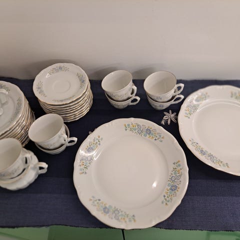 Käsinmaalattu 12 kupin ja lautasen kahviastiasto sekä iso tarjoilulautanen leivonnaisille. Valkoiselle posliinille maalattu vaalean ja tummemman lilan sävyisiä valuvia kuvioita. Astiasto on virheetön.