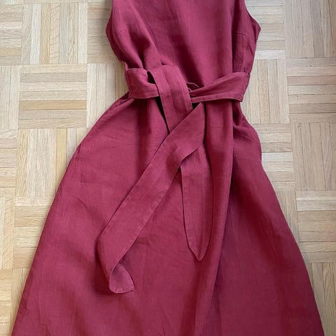 Nanson Luoto-mekko, koko 40, tummanpunaista pellavaa. Upea, pitkä mekko, vyön voi solmia eteen tai taakse. Ohut puuvillavuoritus. 160-senttisellä pituus ulottuu nilkkoihin. Kaikai 49 cm.