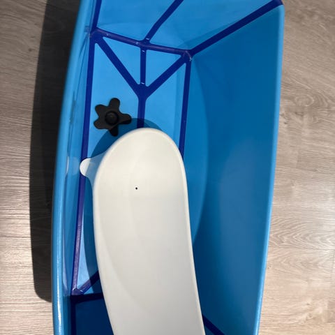 Stokke Flexi Bath -taitettava vauvan kylpyamme. Ammeessa on pohjassa tulppa veden tyhjentämistä varten sekä liukuesteet. Tulppa vaihtaa väriä, jos vesi on liian kuumaa. Mukana erillinen vauvan kylpytuki, joka helpottaa pienemmän vauvan kylvettämistä. Amme on taitettava, joten kätevä säilyttää. Meillä säilytetty aukinaisena, hyvä kunto myös kumiosien osalta.