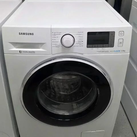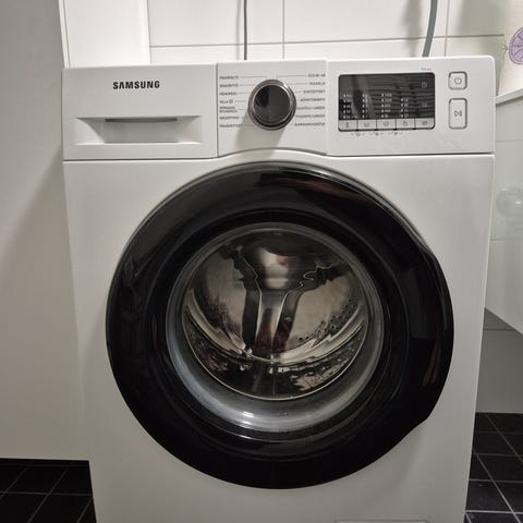 Samsungin pyykinpesukone, malli WF1702NHWG, kapasiteetiltaan 7 kg. Etupaneelissa on useita pesuohjelmia ja digitaalinen näyttö. Koneen takaosassa on liitäntäletkut ja virtajohto. Toimiva.