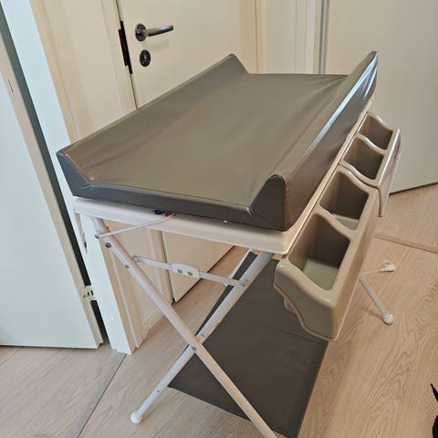 Jollyroomista ostettu elokuussa 2025 Beemoon hoitopöytä, jonka alla amme. Mukaan myös kylpytuki!