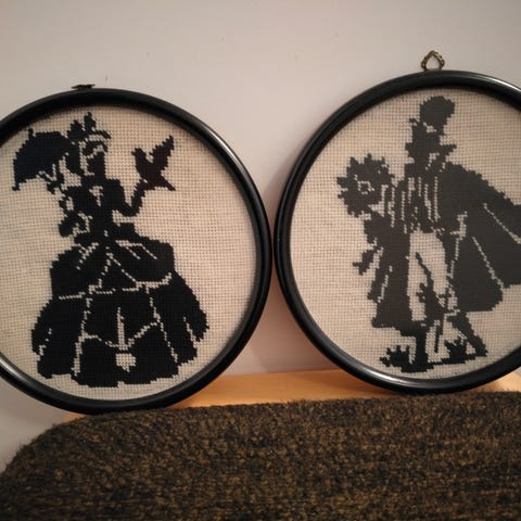Hyväkuntoiset pienet (halkaisija 26cm) kanavatyö ruusu taulut