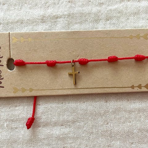 Uniikki puuvillapunottu ranneke kirjaillulla ristillä. Säädettävä.