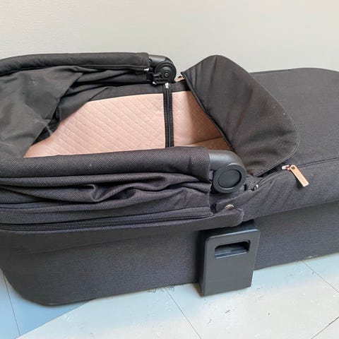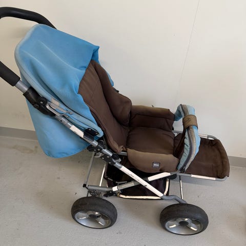 Toimivat rattaat. Kuomun sininen väri haalistunut.