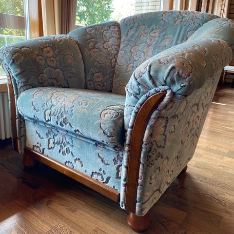 Upeat vanhat puiset nojatuolit ihanalla vaaleansinisellä verhoilulla ja upeilla yksityiskohdilla.