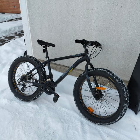 Fatbike polkupyörä 26" renkailla. Runkomateriaali metallia, väri musta punaisilla vanteilla. Leveät renkaat soveltuvat ajoon lumessa ja pehmeällä alustalla. Pyörässä on satula, polkimet, käsijarru takana sekä suoramallinen ohjaustanko. Soveltuu henkilölle, joka käyttää 26" kokoista pyörää. Vaihdettu uusi takajarruvaijeri ja takajarrukahva.