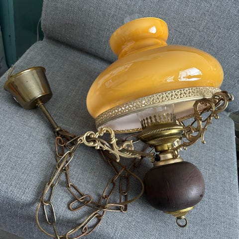 Vanha, kauniinkeltainen lasinen pöytälamppu. Täysin ehjä, ei rikkoja.