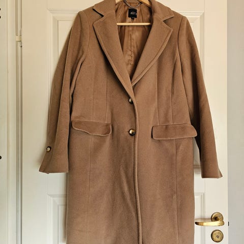 Ril’s uusi (laput poistettu) tyylikäs, ruskean värinen villakangastakki, jossa kaksirivinen napitus. Takissa on 3/4-pituiset hihat ja etutaskut. Kuvan väri ei vastaa todellisuutta. Väri on perusruskea, ei kellertävä kuten kuvissa.