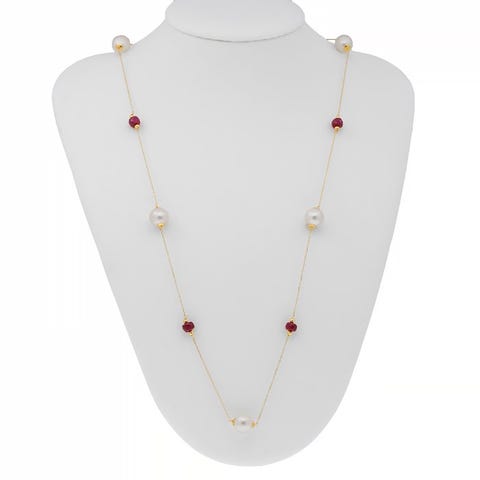 Tahiti-helmi Ranskan Polynesiasta ja jalokivisten rubiinien nauhaValkoinen väri ja korkea kiiltoJalokivisten rubiinien nauha, 3 mm pyöreäfacettinen, 42 cm pitkäLukko ja renkaat on valmistettu 18K keltaisesta kullastaMaailmanlaajuinen toimitusTuotteella on laatikko ja sertifikaatti