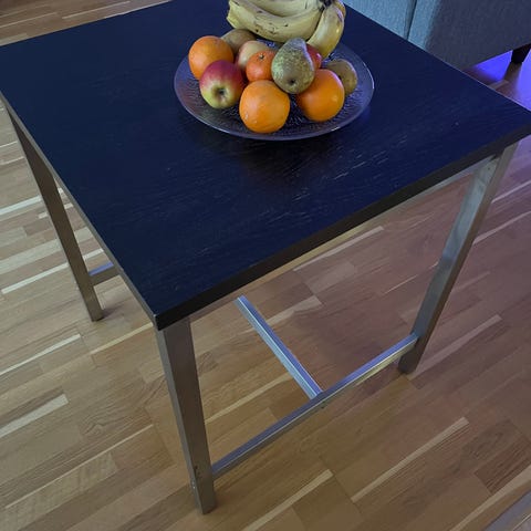 Käytön jälkeä, mutta pienellä fiksauksella hieno, näppärä ja kestävä pöytä. Painaa aika paljon, jalka säädettävissä, seinään kiinnitettävä. En varaile. (Silityslauta osoittamassa mittaa, ei löytynyt mittanauhaa)