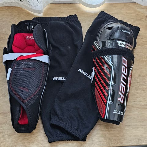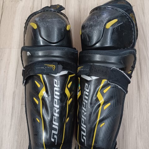 Bauer Supreme jääkiekkosäärisuojat, koko 11" / 28 cm. Sisäpuolella on pehmustettu vuori ja tarrakiinnityshihnat säärisuojien kiinnittämistä ja säätämistä varten. Kunto hyvä
