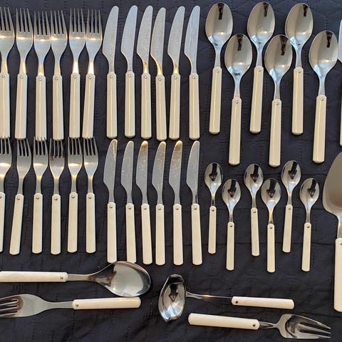 Kuvien käytetyt aterimet kiertoon tarpeettomina, vaikka sarjojen täyttöön, jos tarvetta, pari kahvilusikkaa teräsosat aika sumeita, muutoin ihan hyväkuntoisia edelleen, katso kuvat.