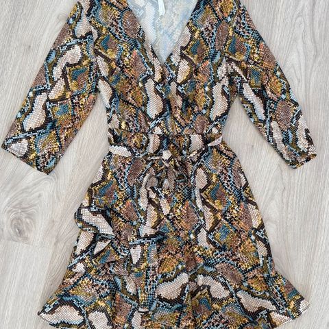 Kahdesti käytetty. Object naisten mekko kokoa S. Mekossa on kirjavapohjainen, leopardikuvioinen kuosi ja pitkät hihat. Materiaalina on polyamidi, sekä päällikangas että vuori strechiä.