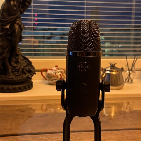 MyydäänBlue Yeti mikrofoni sekä Blue mikrofoniteline jossa valmiina shock mount.