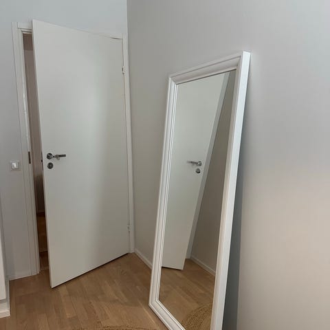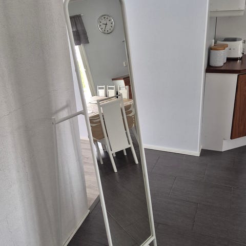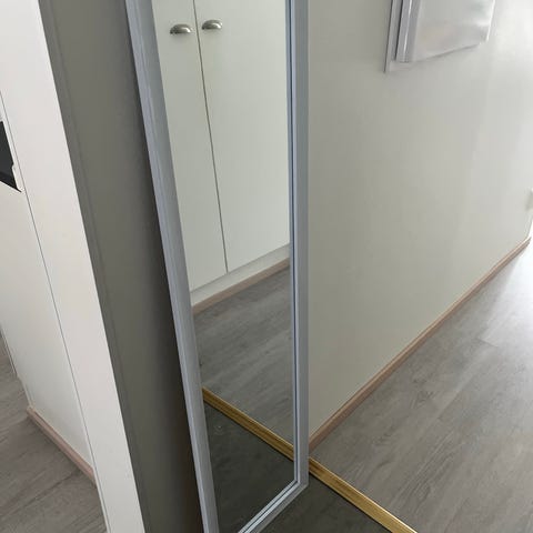 IKEA kokovartalopeili valkoisella kehyksellä. Peili on kapea ja korkea, soveltuu esimerkiksi eteiseen, makuuhuoneeseen tai vaatehuoneeseen. Peili voidaan käyttää lattialla seinää vasten tai kiinnittää seinälle, kiinnitystavasta riippuen