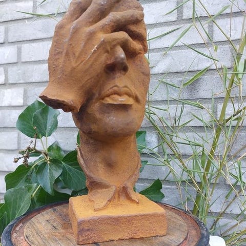 Valurautainen veistos. Istuva gargoyle, demoni.Erittäin kauniisti tehty, huomioiden yksityiskohdat. Rautaan liittyvä ruosteinen väri antaa kokonaisuudelle rustiikkisen vivahteen.Erittäin koristeellinen sekä sisä- että ulkotiloihin.MittojaKorkeus: 16 cmLeveys: 16,5 cmSyvyys: 11 cmVakuutettu lähetys track and trace -palvelulla.