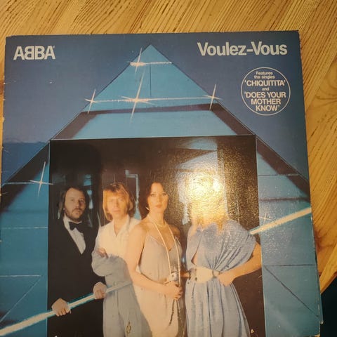 ABBA The Visitors lp-levy, siistissä kunnossa, kannessa vähäistä kulumaa ja rei'ttimellä tehty reikä.