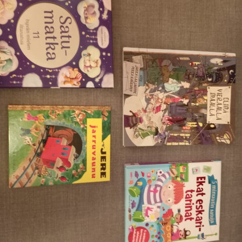 Myydään kuvassa näkyvät lastenkirjat. Helppolukuisia kirjoja, klassikko satuja. 5 euroa yhteensä.