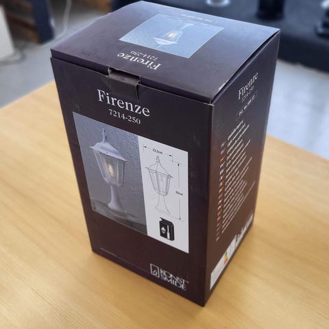 Konstsmide Firenze 7214-750 ulkovalaisin. Jalallinen, lyhtymallinen valaisin ulkokäyttöön. Väri musta. Korkeus noin 50 cm ja leveys noin 21,5 cm (pakkauksen kuvien mittojen mukaan). Soveltuu esimerkiksi pihalle, terassille tai sisäänkäynnin yhteyteen. Lampputyyppi ja tarkemmat tekniset tiedot pakkauksen mukaan.