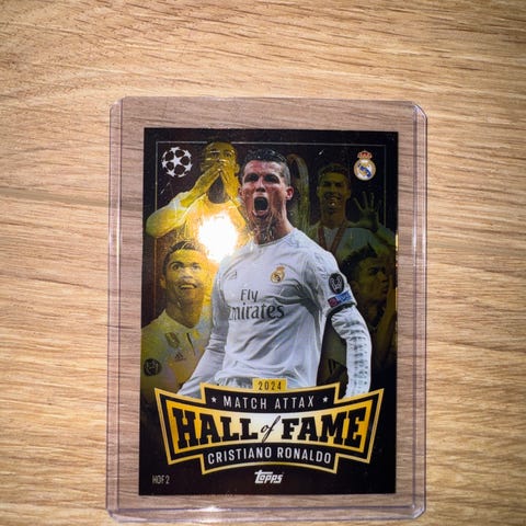 Topps Match Attax Hall of Fame Ronaldinho jalkapallokeräilykortti. Kortti esittää Ronaldinhoa FC Barcelonan peliasussa ja kuuluu Hall of Fame -sarjaan. Kortin taustapuolella on englanninkielinen teksti pelaajan urasta Mestarien liigassa. Kortti on muovisessa suojakotelossa.