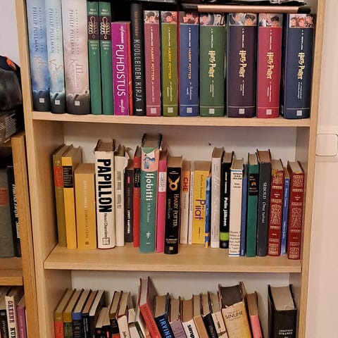 Annetaan kuvan oikeanpuolimmainen kirjahylly (jossa tasot) alakaapin ovea pitää hieman kiristää ja takalevy vaatisi muutamaa uutta naulaa. Muuten siisti. Saa kuljetusta varten kahteen osaan.