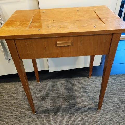 Myynnissä kunnostettu 60-luvun Singerin tiikkinen ompelukonepöytä ilman konetta. Sopii hyvin myös kirjoituspöydäksi tai muuksi työpöydäksi.
