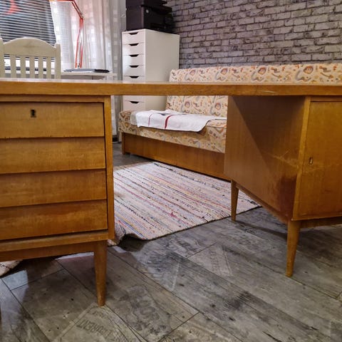 Kannesta on poistettu vanha maali- ja lakkapinta. Viilu on puhdistettu ja uudelleenlakattu sekä öljytty. Lakkapinnat on uusittu mattapintaisella venelakalla, joka kestää myös kosteutta. Muut osat on puhdistettu, lakkapinta freesattu ja öljytty. Tästä hieno ja tukeva pöytä suoraan käyttöön. Viilupinta on kaunis ja hyväkuntoinen. Pöydän tausta on myös viimeistelty, joten voi sijoittaa myös muualle kuin seinän viereen.