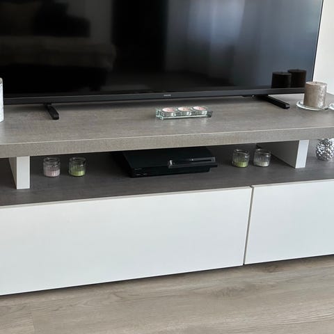 Valkoinen tv-taso, jossa on useita laatikoita säilytykseen. Sopii olohuoneeseen tai makuuhuoneeseen tv-tasoksi tai matalaksi säilytyskalusteeksi.