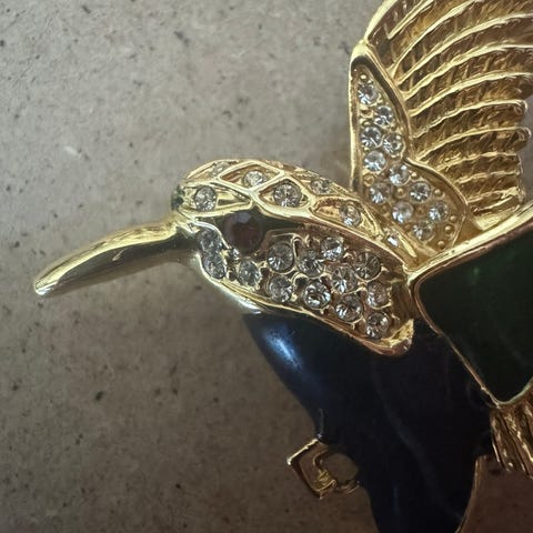 Vanha kolibri rintaneula kimaltavilla kivillä.