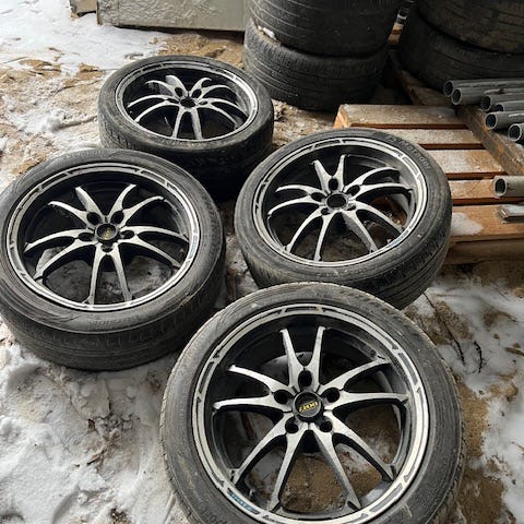 jotkut lippavanteet, kumit kaikissa ihan hyvässä kunnossa. Yhessä vanteessa vähän kanttarijälkeä. Hinta tarjoa!