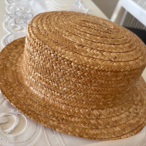 Erinomainen kunto. Itselleni liian pieni, muuten en luopuisi. Olen itse pujottanut hattuun kaksi keltaista paperinarua, joiden avulla olen saanut pysymään takaraivolla :)