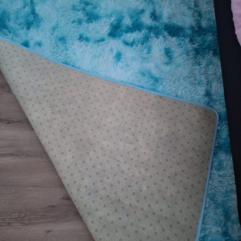 230x160 sini-harmaa pehmeä, tiheään neulottu viskoosimatto.