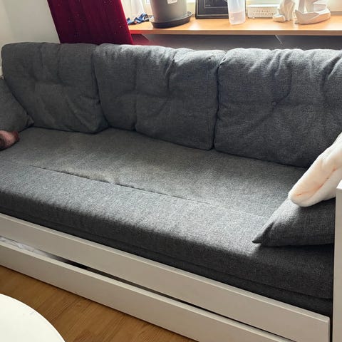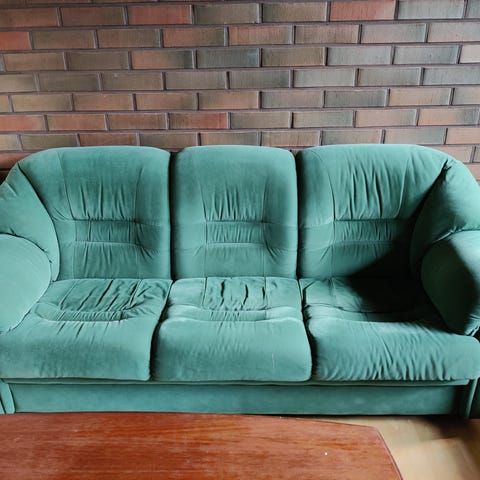 Ihan ok kunnossa oleva tumman vihreä sohva. Ollut koirataloudessa, josta muistona pieni puremajälki sohvan alanurkassa. Saa varmasti siistittyä melko huomaamattomaksi. Puhdistetaan karvoista mahdollisimman puhtaaksi.
