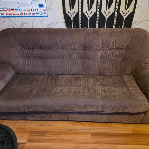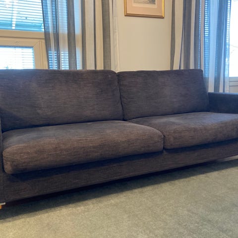 Kolmen istuttava sohva, jossa vaalea beige kangasverhoilu. Sohvassa on kolme erillistä istuin- ja selkänojaosaa sekä pyöristetyt käsinojat. Sopii olohuoneeseen tai muuhun oleskelutilaan istumapaikaksi useammalle henkilölle.