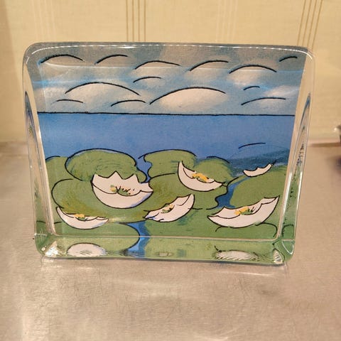 Teoksessa syksyinen koivumetsä-aihe, kirkkaan lasimassan sisään toteutettuna.