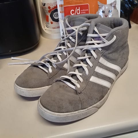 Adidas tennarit, koko 42. Väriltään mustat valkoisilla raidoilla ja kantapääosalla. Nauhakiinnitys ja kumipohja, jossa kuvioitu pinta. Päällinen mokkatyyppinen.