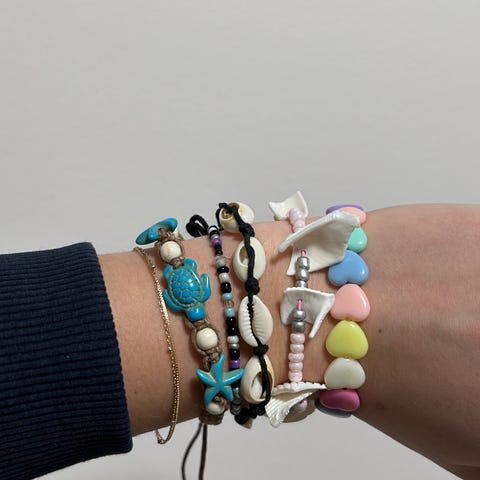 Zara rannekoru naisille. Rannekorussa on pyöreitä korukivihelmiä vaaleissa sävyissä sekä kullatut metalliosat. Kivien välissä on pieniä metallivälikappaleita ja säätöketju, jonka avulla pituutta voi mukauttaa ranteeseen sopivaksi. Sopii käytettäväksi arjessa tai juhlavammissa asukokonaisuuksissa.