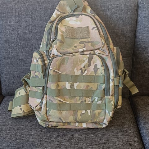 Lekan jämä-sarjan näkemys neukkulaisesta kärsimyssäkistä. Simppeli kuin mikä, etutasku sulkeutuu tarranauhalla. Kangas täyspuuvillainen m/62 mukaelma. Koko noin 67x43 cm.